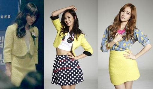 사진 속 송혜교는 봄 내음이 물씬 풍기는 옐로우톤의 스커트와 재킷의 투피스 룩을 입고 여성스러운 매력을 과시했다. 반면에 소녀시대 유리와 제시카는 재킷과 스커르를 각각 매치해 자신만의 개성이 묻어나는 발랄한 스타일을 완성했다.