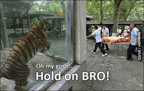 공개된 사진에는 한 동물원에 갇힌 호랑이가 들것에 실려 가는 호랑이 캐릭터 옷을 입은 사람을 안타깝게 바라보고 있다. 특히, ‘맙소사! 형제여 잠깐만!’이라는 뜻의 영어 문구가 적혀 있어 보는 이들의 웃음을 자아낸다.