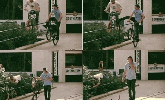 공개된 영상 속에는 자전거를 타는 두 친구의 모습이 담겨 있다. 한 남성이 화단 난간 위에 자전거를 타고 묘기를 부리자 옆에 있던 친구는 순간 장난기가 발동해 친구의 자전거를 발로 뻥 걷어찼다.