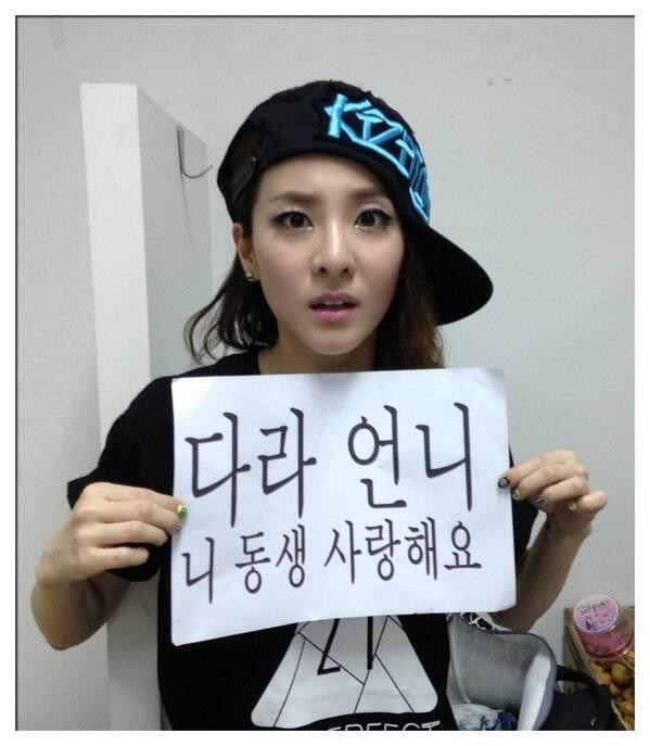 공개된 사진 속 산다라박은 “다라 언니 니 동생 사랑해요”라는 메시지가 적힌 종이를 들고 있다. 산다라박은 친동생 천둥이 소속돼 있는 엠블랙 팬클럽 A+가 응원하는 글을 받고 황당한 표정으로 카메라를 응시해 보는 이들의 웃음을 자아냈다.