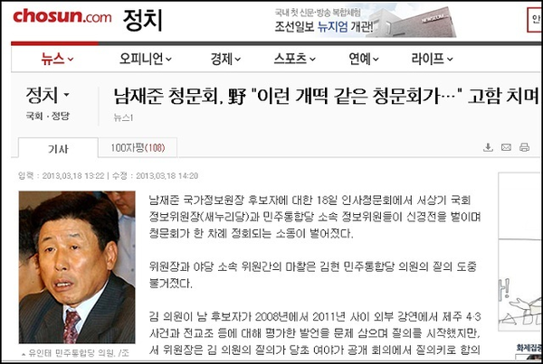 남재준 국가정보원장 후보자에 대한 18일 인사청문회에서 서상기 국회 정보위원장(새누리당)과 민주통합당 소속 정보위원들이 신경전을 벌이며, 청문회가 한 차례 정회되는 소란이 벌어졌다고 뉴스1이 전했다. 주로 남재준 후보자의 이념이나 사상에 대한 논란 때문이 아니라, 이런 사상을 검증하려는 야당 의원들이 여당과 미리 약속한 청문과정을 어기고 이념에 대해 남재준 후보자에게 서둘러 질문하면서, 의사진행 과정에 불만을 품은 야당 의원들이 사회자에게 소란을 피웠다고 한다.
