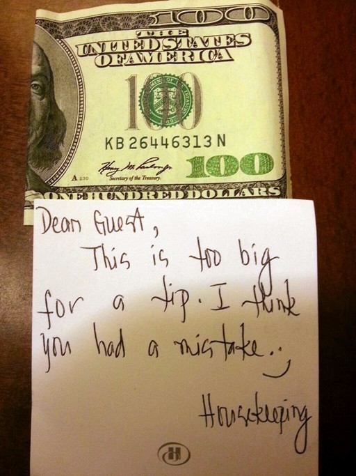 공개된 사진 속에는 미화 100달러와 작은 쪽지가 담겨 있다. 쪽지에는 "손님, 이건 팁으로 받기엔 너무 큰 액수네요. 실수로 주신 것 같아요 - 하우스 키퍼"라고 적혀 있다.