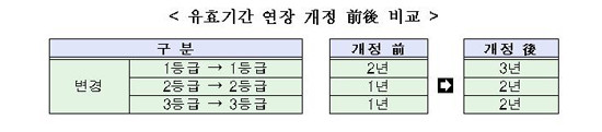 보사부는 또 심신상태 변화가 거의 없음에도 잦은 갱신 조사로 불편을 호소하는 고령 및 중증 수급자의 불편을 완화하기 위해 장기요양 등급판정 유효기간은 1년을 원칙으로 하되, 연속하여 2회 이상 같은 등급을 받은 경우 2년 또는 3년 부여하는 것을 내용으로 하고 있다.