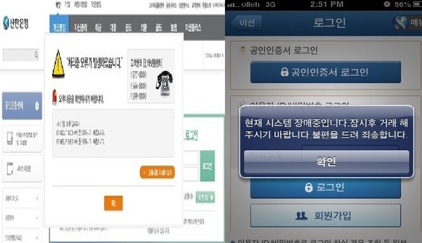 신한은행은 이날 오후 2시20분부터 약 1시간 30분가량 전산망 마비로 인터넷뱅킹, 스마트뱅킹, ATM 등 영업망이 장애를 겪었다.