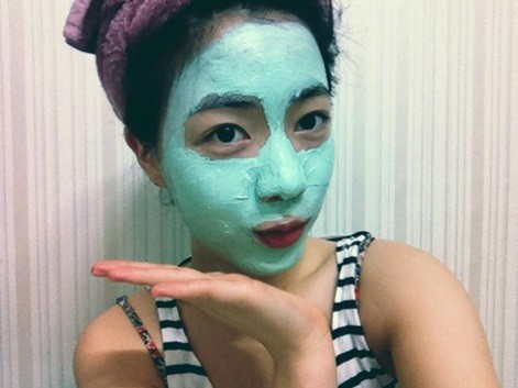 공개된 사진 속 화영은 흰 색과 검은 색 줄무늬 민소매 티를 입고 팩을 한 채 깜찍한 포즈를 취하고 있다.