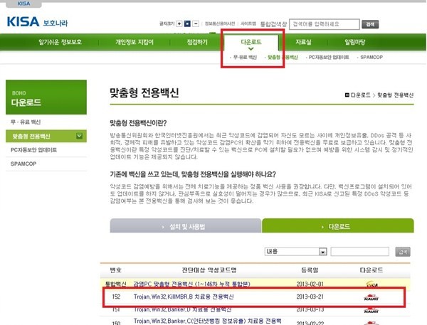 KISA 보호나라(www.boho.or.kr) 사이트에서 [다운로드-맞춤형 전용백신] 메뉴 → 152번 Trojan.Win32.KillMBR.B 치료용 전용백신 다운로드 아이콘을 클릭 및 실행한다.