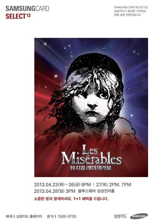 삼성카드로 티켓 예매시 추가 티켓을 한 장 더 제공하는 1+1 혜택, 공연 추억을 간직할 수 있는 즉석사진 촬영, 공연의 이해를 돕기 위한 연출가의 사전해설 프로그램 등 문화 관람의 가치를 극대화 시켜 줄 수 있는 실용적인 서비스를 제공한다.삼성카드 셀렉트 12 – 뮤지컬 레미제라블은 오는 4월 23일부터 28일까지 서울 한남동 블루스퀘어 삼성카드홀에서 공연된다.프리미엄 회원의 경우 3월 21일, 일반회원은 3월 22일부터 삼성카드 홈페이지(www.samsungcard.com)를 통해 1인당 2매까지 사전예매할 수 있다.삼성카드는 공연과 관련된 다양한 이벤트도 마련했다.공연 시작 전 연출가가 직접 무대에 올라 뮤지컬 레미제라블의 시대배경, 줄거리 등 생생한 공연정보를 들려주는 무대해설의 시간이 진행되다.공연이 끝난 후에는 무대 출연자들과 함께하는 경품행사, 폴라로이드 즉석 추억남기기 이벤트 등도 있다.뮤지컬 레미제라블은 '오페라의 유령, 캣츠, 미스사이공'과 함께 세계 4대 뮤지컬로 꼽히는 작품으로 공연 27년 만에 한국어로 초연되는 작품이다.1985년 영국 런던에서 초연된 이후 토미상, 그레이상 등 70여개 이상의 뮤지컬상을 석권했으며, 전세계 43개국, 총 6천 만 명 이상이 관람하는 등 예술성과 대중성의 양면에서 모두 성공을 거둔 것으로 평가받고 있다.한편 삼성카드 셀렉트는 지난 2011년 조용필 & 위대한 탄생 공연을 시작으로 버스커버스커 콘서트, 싸이의 썸머스탠드 흠뻑쇼, 뮤지컬 엘리자벳 등 대중적이면서도 수준 높은 문화 공연을 1+1의 혜택으로 선보여 왔다.매 공연마다 삼성카드를 이용한 결제율이 90%를 상회할 정도로 고객들로부터 많은 인기를 모으고 있다."삼성카드는 고객들이 수준 높은 공연을 누구나 즐길 수 있도록 관람의 기회를 확대하고, 언제나 접할 수 있도록 정기적으로 다양한 문화공연 혜택을 마련해 오고 있다""앞으로도 삼성카드 셀렉트는 국내 최고 수준의 다양한 문화공연을 고객들이 꼭 필요로 하는 것을 담아 쉽고 편하게 볼 수 있도록 하여 문화공연에서도 삼성카드의 브랜드 정신을 체감할 수 있도록 하겠다"- 삼성카드 관계자