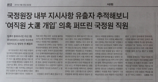 그 내용을 빼돌린 배신자는 지난 2월 국정원에서 파면된 중견 직원 정모(49)씨라고 22일자 <조선일보>는 보도했다. -