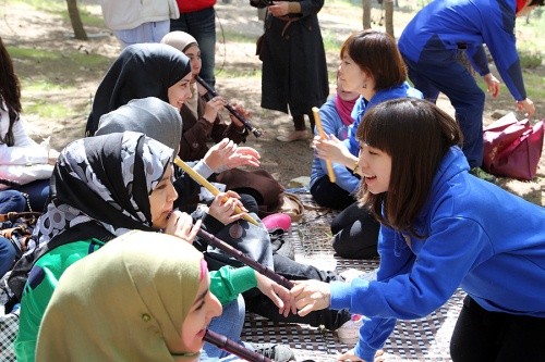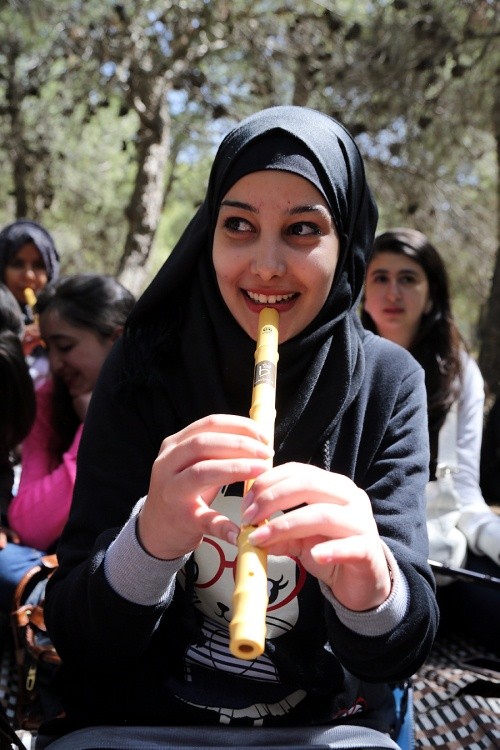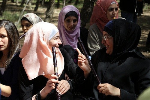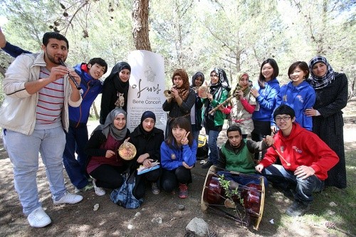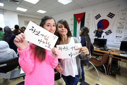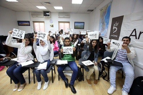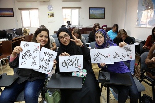 - ▲ '아리랑'을 알리는 목적으로 세계일주 중인 '코리아 아유(아리랑 유랑단) 레디'팀이 요르단대학교에 도착, '아리랑 베네 스쿨'을 개최하고, 학생들과 즐거운 문화교류시간을 보내고 있다.