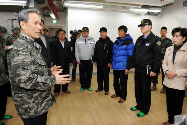 김관진 장관 일행은 백령도 주민들을 위한 대피소를 찾아 시설을 둘러보고 주민들의 애로사항을 들으며 면담을 나눴다.