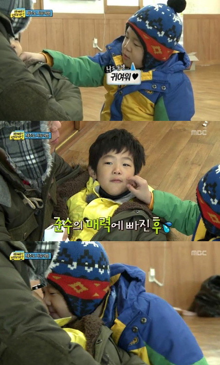 윤민수는 “너 지아는 뽀뽀해주자나”라며 너스레를 떨었고, 윤민수가 준수 볼에 뽀뽀를 하자 후도 1살 동생인 준수에게 뽀뽀하며 남다른 애정을 과시했다. 준수 역시 싫지 않은 듯 미소를 지어 웃음을 자아냈다.