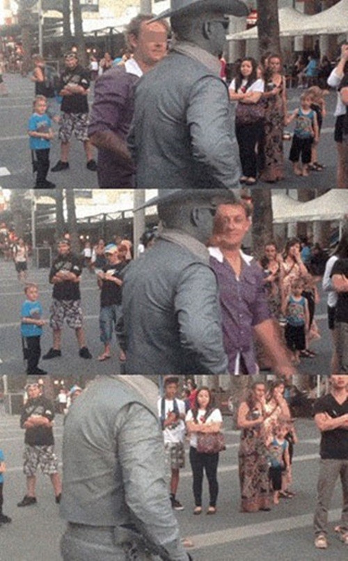 그런데 이때 동상인 줄 알았던 카우보이 동상이 갑자기 움직이며 남성의 얼굴을 가격해 버린다. 사실 카우보이 동상이 아닌 동상으로 분장한 사람이었던 것. 움직인 동상에 맞은 남성 뿐 아니라 지나가던 사람들까지 일제히 걸음을 멈추고 놀랍다는 듯 바라보고 있다.