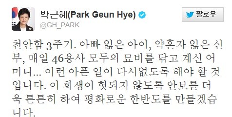 아들의 얼굴을 씻기듯 매일같이 묘비를 닦고 계신 어머니의 눈물과, 아들이 남겨놓은 방을 아직도 정리하지 못하고 계신 아버님의 마음과, 천안함 용사들의 유가족 여러분의 아픔을 결코 잊지 않을 것이다.”박 대통령은 같은날 국무회의에서도 “북한의 거듭된 도발로 국민들의 걱정이 많은데 강력한 국방태세와 흔들림 없는 국정운영으로 국가의 안보와 국민의 안전을 지켜야 할 것”이라고 거듭 강조했다.