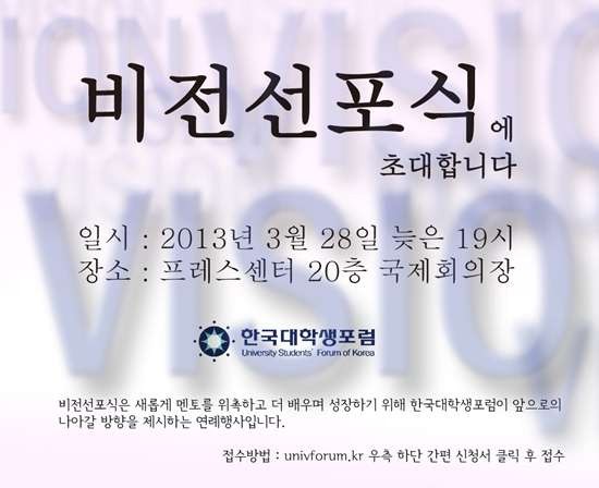 한국대학생포럼(한대포)이 [2013 비전 선포식]을 오는 28일 19시 서울 프레스센터 20층 국제회의장에서 연다.