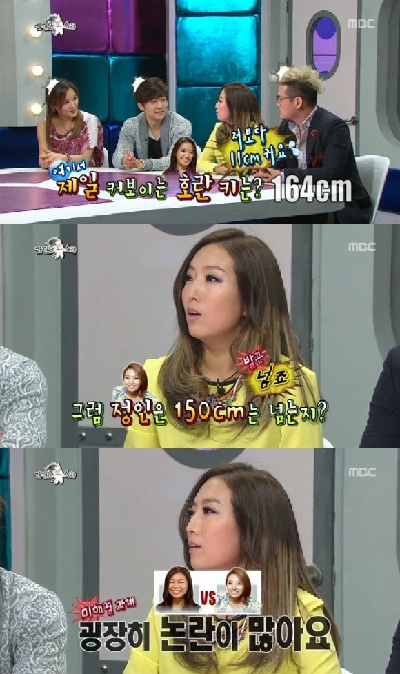MC 김국진은 "박정현보다 큰가 작은가?"라고 물었고 정인은 "이게 사실 굉장히 논란이 많다. 나는 크다고 생각하는데 박정현은 어떻게 생각하는지 잘 모르겠다"고 말해 좌중을 웃음바다로 만들었다.