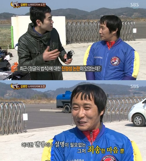 개그맨 김병만이 SBS '정글의 법칙' 진정성 논란에 대해 사과했다.지난 27일 방송된 SBS '한밤의 TV연예'에서는 제작진이 스카이다이빙에 도전하는 김병만을 찾아갔다.
