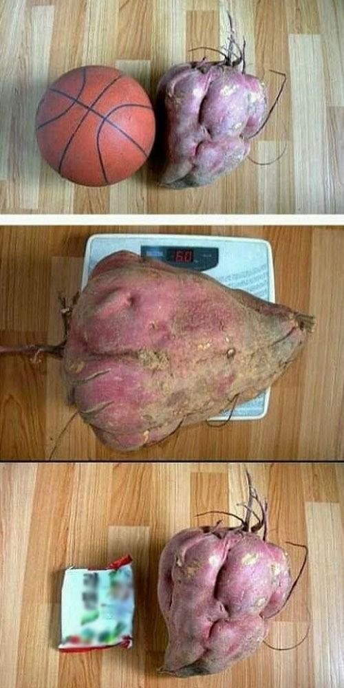 공개된 사진에는 겉으로는 평범해 보이는 고구마 한 개가 등장한다. 그런데 이 고구마의 크기는 농구공과 비슷하며 라면보다 훨씬 크다. 특히, 일반적인 고구마가 박스로 포장돼 6kg으로 팔리는 것에 반해 이 고구마 자체의 무게가 무려 6kg이나 된다.