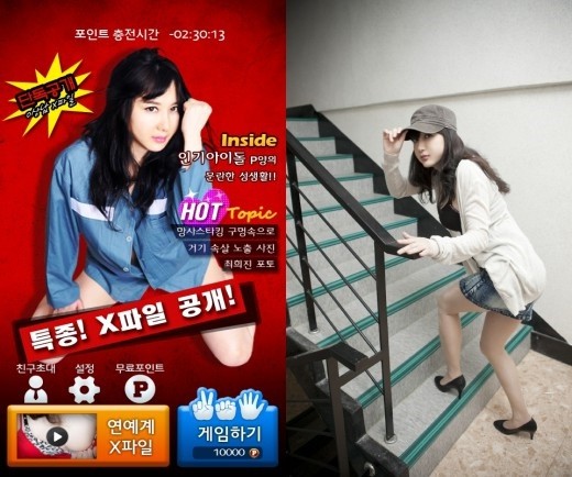 최희진이 등장하는 게임 ‘특종 X파일’ 영상은 최근 한 포털사이트 블로그와 유튜브 등에 게재됐으며, 이미지에는 ‘인기 아이돌 P양의 문란한 성생활’ 등의 자극적인 문구도 등장한다.
