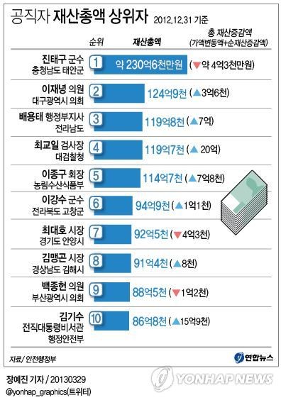 이중 가장 많은 재산을 신고한 사람은 진태구 태안군수로 230억6,000만원이며, 대구시 이재녕의원이 124억9,000만원을 신고했다.
