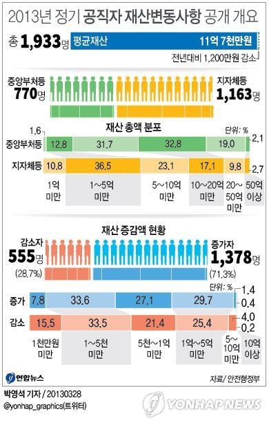 또 신고대상자의 71%는 재산이 늘었다고 신고했으나, 평균 재산액은 1,200만원 줄어들었다.