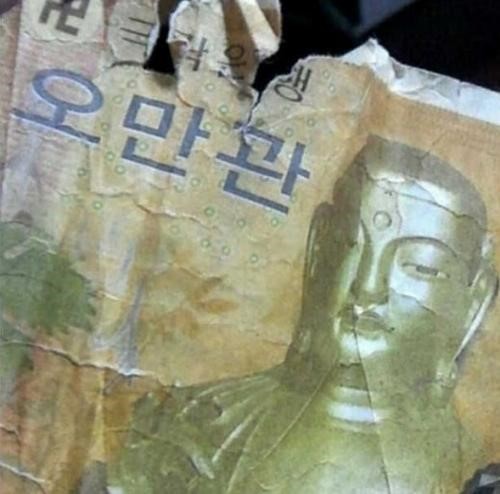 공개된 사진 속에는 오만 원권 지폐 한 장이 담겨 있다.
