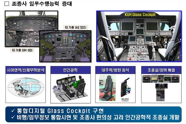 일단 UH-60 등 기존의 기동헬기와 비교해 3차원 전자지도, 통합헬멧시현장치, 4축 자동비행 조종장치 등을 장착해 주·야간 구별 없이 악천후에도 전술기동이 가능하며, 비행조종컴퓨터를 통해 전후좌우, 회전 및 상승/하강에 대한 자동제어가 가능해 졌다고 한다.