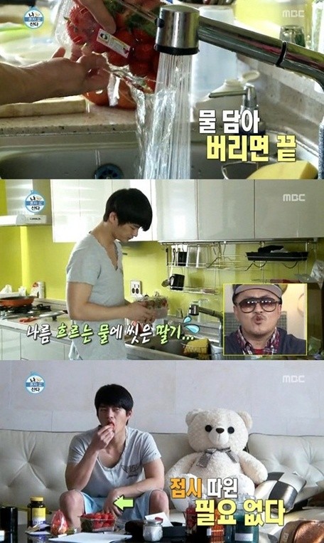 이날 서인국은 샤워 후 간식으로 냉장고에서 딸기 한 팩을 꺼냈다. 그런데 그는 딸기를 포장용기에서 꺼내지도 않고 흐르는 물에 대충 씻은 뒤 소파에 앉아 접시에 담지도 않은 딸기를 먹었다.