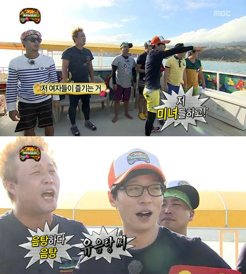 이어 유재석은 자신도 모르게 “저게 하와이다. 미녀들하고 저렇게..”라고 말했다. 이에 다른 멤버들은 “저 미녀들하고?”, “음탕하다. 유음탕씨” 등 유재석의 흑심을 비난했다.