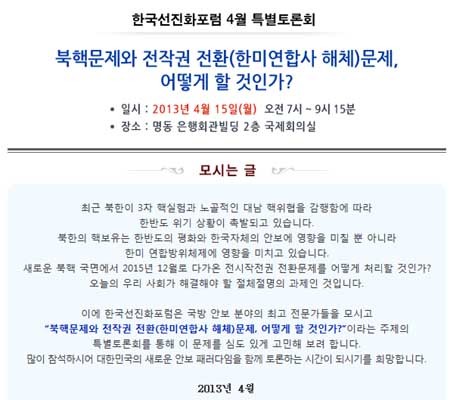 새로운 북핵 국면에서 2015년 12월로 다가온 전시작전권 전환(한미연합사 해체) 문제를 어떻게 처리할 것인가?"선진화포럼의 긴급토론회는 오는 4월 15일 오전 7시부터 서울 명동 은행연합회관 2층 국제회의실에서 열린다.