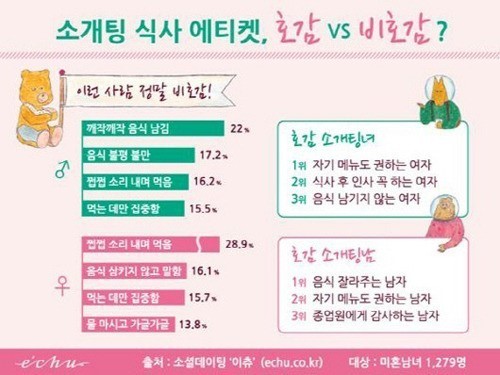 소개팅 식사 비호감 1위가 공개됐다.29일 소셜데이팅서비스 이츄는 20세 이상 미혼 남녀 1,279명(남성 650명, 여성 629명)을 대상으로 ‘소개팅 식사 에티켓’에 대한 설문조사를 진행했다.