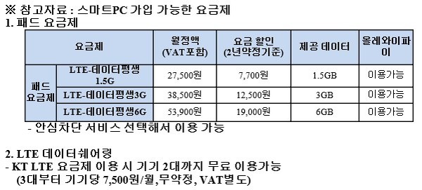 KT LTE 요금제를 이용 중인 고객의 경우 2대까지 무료로 LTE 데이터용량을 같이 사용할 수 있는 ‘데이터쉐어링’을 통해 별도의 비용 없이 이용 가능하다.