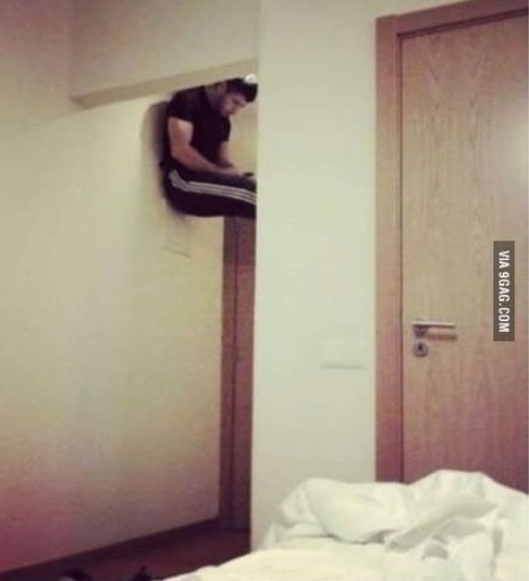 공개된 사진 속 한 남성은 좁은 벽 사이에 몸을 끼워 의지한 채 천장에 붙어 휴대폰을 만지고 있다. 특히, 위층의 와이파이를 몰래 이용하려는 듯한 행동으로 보는 이들에게 웃음을 안겼다.