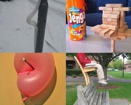 두 번째 사진은 한 개의 젠가가 수십개의 젠가를 떠받치고 있으며, 세 번째 사진은 못이 박힌 풍선이 터지지 않는 모습이다. 또, 네 번째 사진은 벤치 위에 의자를 놓고 아슬아슬하게 앉아있는 한 남성의 모습이 눈길을 끌었다.