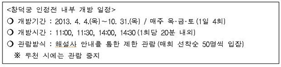 창덕궁 인정전 내부는 매년 겨울철(11월~다음 해 3월)에 개방이 중단되고, 봄철부터 가을철까지 개방할 예정이다. -