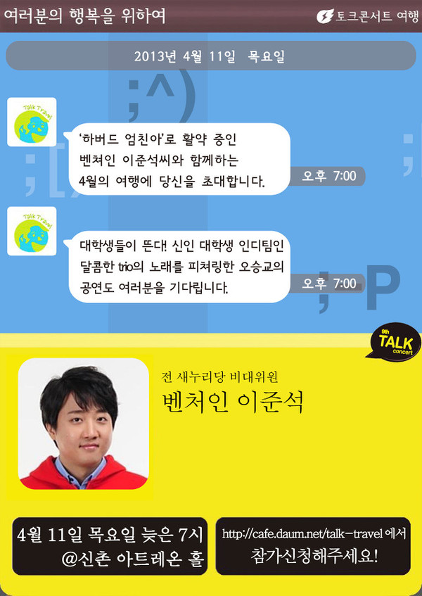 참가신청은 '토크콘서트-여행' 사이트(cafe.daum.net/talk-travel)에서 하면 된다.