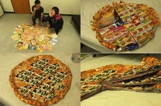 공개된 사진에는 두 명의 남성이 등장해 쪼그려 앉아 무언가 골똘하게 생각하고 있는 모습이 담겨 있다. 그들은 돈이 없었는지 전단지 속에 담겨 있는 피자 사진들을 모아 모형 피자를 완성시켰다.