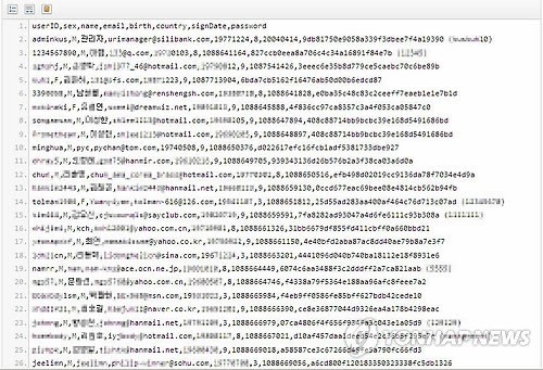 공개된 정보에는 가입자의 아이디·성별·이름·이메일 주소·생일·비밀번호 등이 있다.