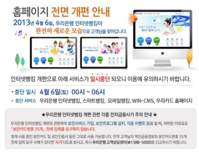이번 조치는 홈페이지 개편 작업에 따른 것으로 우리은행은 고객들에게 메일을 보내 이런 사실을 알리고 이용에 유의할 것을 당부했다.