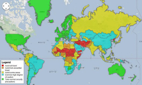 <세계 관광객 위험지도>가 공개됐다.지난 2일 미국 시사잡지 <더 아틀란틱>은 캐나다 외무부가 자국민 해외여행자들에게 안전관련 정보를 제공하기 위해 제작된 <세계 관광객 위험지도>를 소개했다.