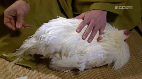 유의태는 조금도 머뭇거림 없이 익숙하게 장침에 이어 대침을 찔러도 닭은 가만히 있다.