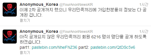 <어나니머스>는 자신들의 트위터를 통해 "이번 2차 공개로 우리민족끼리에 가입한 분들의 정보는 다 공개된 것"이라고 설명했다.