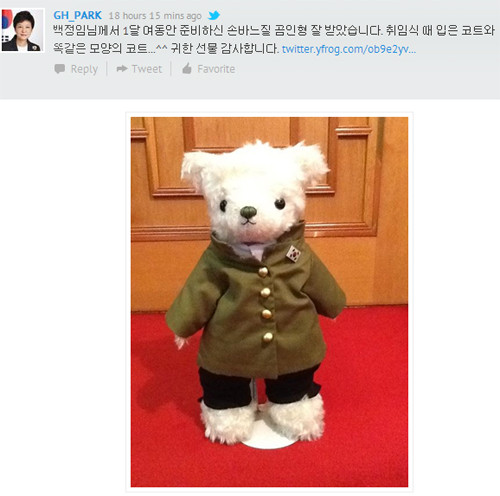 취임식 때 입은 코트와 똑같은 모양의 코트... ^^ 귀한 선물 감사합니다."박근혜 대통령이 취임 후 두번째로 자신의 트위터에 글을 게재했다.