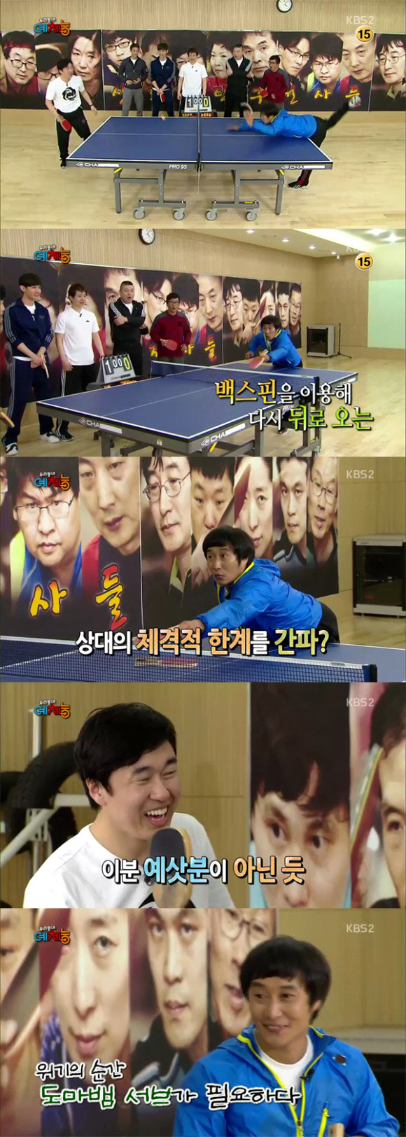 이어 김병만은 취권 서브, 뜨거운 탁구공을 만지는 코믹한 탁구 제스쳐를 선보여 강호동의 거센 항의를 받았다. 2연타 강스매싱 공격을 받은 강호동은 김병만의 코믹탁구에 대해 경고를 요구했다. 이에 박성호는 “원래부터 살았으면 모르는데 여기서 갑자기 이러면 경고예요”라며 솔로몬의 판결을 내려 김병만의 코믹한 탁구 공격에 브레이크를 걸었다.