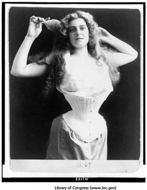 하지만 이 여성의 몸매는 자연적인 게 아니다. 그 당시 여성들은 코르셋으로 상체를 강하게 압박한 결과 모래시계 체형(영어식 표현으로는 말벌 허리)을 유지했다.