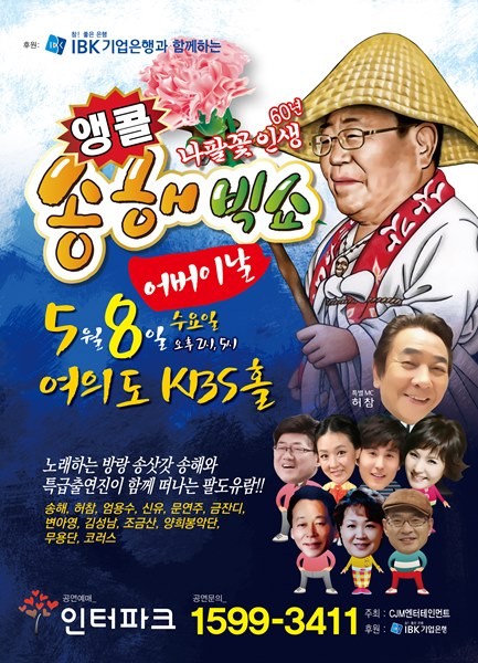 87세의 청년 [송해]가 오는 5월 8일 서울 여의도 KBS홀에서 <나팔꽃 인생 60년 송해 빅쇼(이하 송해 빅쇼)>로 대장정의 피날레를 장식한다.지난 2011년 9월 장충체육관에서 시작한 <송해 빅쇼>는 전국을 순회하며 대구-전주-부산-대전-제주 등 총 18개 지역에서 2년 간 40회 공연을 마쳤으며, 이번 공연으로 전국 투어 42회를 기록하게 됐다.이번 <송해 빅쇼>는 송해의 원래 본업인 가수 그리고 코미디언, 사회자로서의 모든 것을 보여줄 예정이다.베테랑 사회자 허참의 진행으로 가수 [트로트 아이돌] 신유, 문연주, 금잔디와 코미디언 변아영, 김성남, 조금산 그리고 양희봉 악단 등이 대거 무대에 오른다.또한 콘서트에서는 [어르신을 위한 건강토크쇼]도 펼칠 예정이다.“무엇보다도 무대 위에 있을 때는 엔돌핀이 솟아나 나이를 잊을 수 있다.