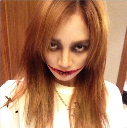 공개된 사진 속 지아는 영화 <다크나이트> 악역인 조커로 분장을 한 채 섬뜩한 표정으로 카메라를 바라보고 있다. 창백할 정도로 하얀 피부와 눈 주위를 검게 두른 다크서클, 귀 부분까지 길게 찢어진 입까지 조커와 싱크로율 100%를 자랑한다.