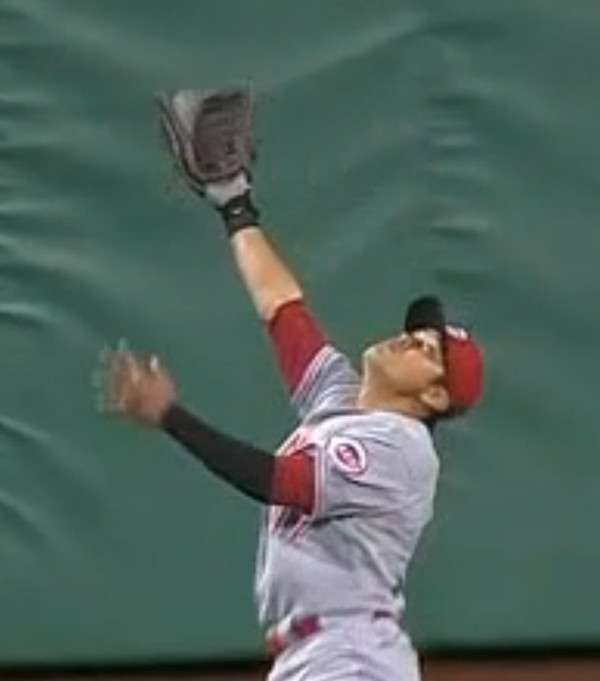 조시 해리슨이 터뜨린 펜스 직전까지 뻗은 2루타성 타구를 끝까지 쫓아가 역동작으로 공을 낚아챘다.