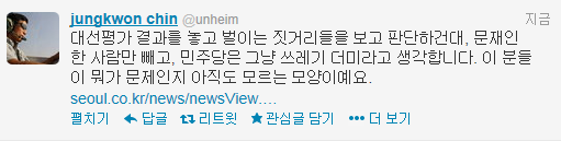 진중권 교수는 13일 자신의 트위터에서 민주통합당 대선평가보고서를 언급하며 다음과 같이 주장했다. -