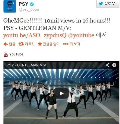 이에 싸이는 자신의 트위터에 "세상에!'젠틀맨' 뮤직비디오가 16시간만에 1천만뷰를 기록했다"는 글을 남기며 놀라움을 감추지 못했다.