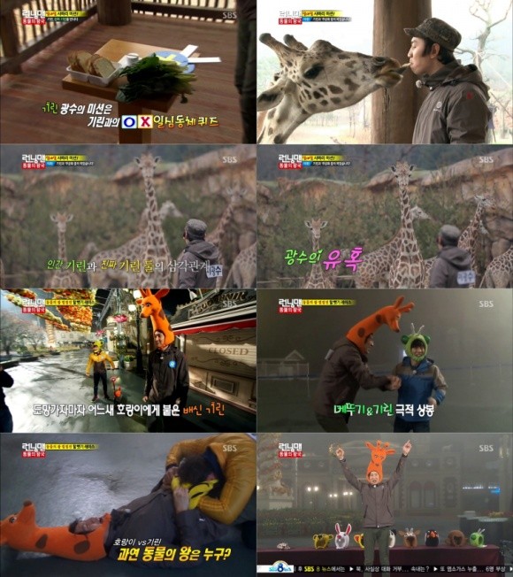 지난 14일 방송된 SBS <일요일이 좋다-런닝맨>에서는 가수 은지원과 소녀시대 제시카가 게스트로 출연한 가운데, 유재석은 메뚜기, 하하 펭귄, 개리 원숭이, 송지효 고양이, 김종국 호랑이, 이광수 기린, 지석진 임팔라, 은지원 판다, 제시카는 토끼로 분해 각 미션을 수행했다.